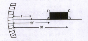 A rectangle ABCD is kept in front of a concave mirror of focal length f with its corners A and B being, respectively, at distances 2f and 3f from the mirror with AB along the principal axis as shown in the figure. It forms an image A’B’C’D’ in front of the mirror. What is the ratio of B’C’ to A’D’ ?