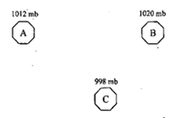 The above diagram represents the pressure conditions of three different places, viz., A; B and C. Which of the following is the correct direction of movement of winds ?