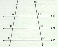 In the figure given below, p, q, r are parallel lines; l and m are two transversals.