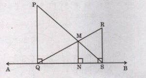 Let two parallel line segments PQ = 5 cm and RS = 3 cm be perpendicular to a horizontal line AB, as shown in the figure given below. The point of intersection of PS and QR is M and MN is perpendicular to QS.