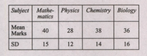 The mean and standard deviation (SD) of marks obtained by 50 students of a class in 4 subjects are given below :